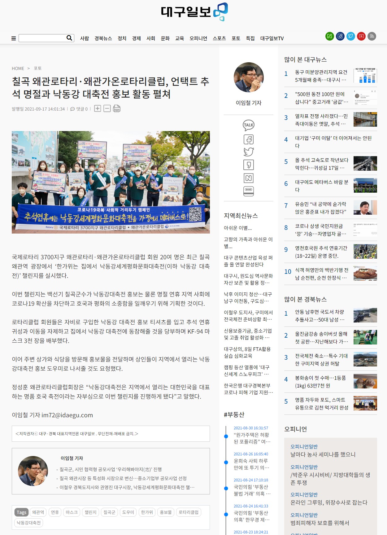 칠곡 왜관로타리·왜관가온로타리클럽, 언택트 추석 명절과 낙동강 대축전 홍보 활동 펼쳐
